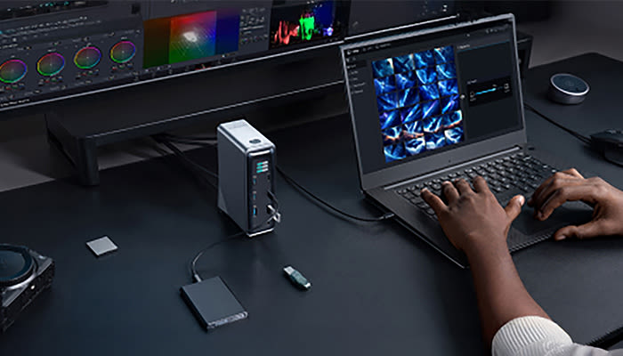 Geschäftsperson am Schreibtisch mit Laptop, silberner USB-Hub mit Kabeln und Computer-Maus auf hellem Holztisch im Büro.