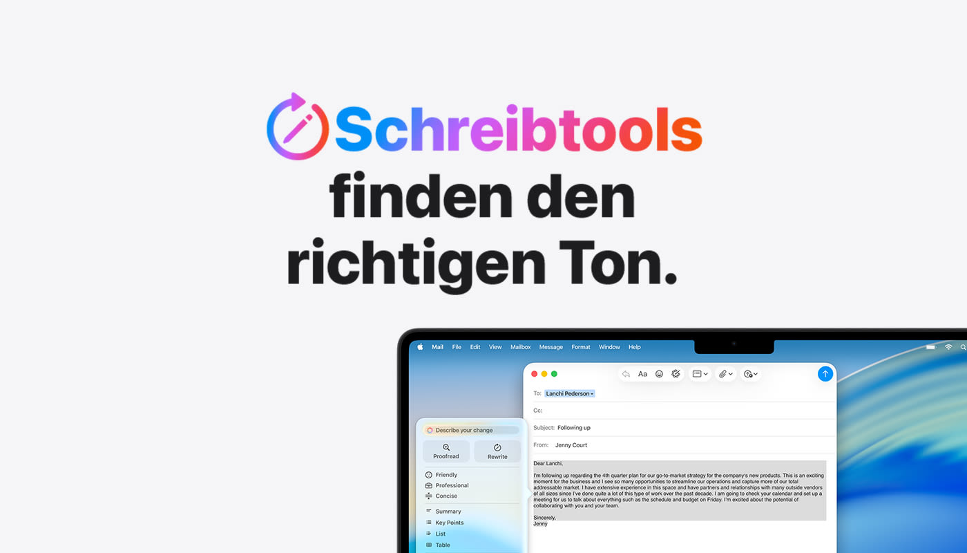 Apple Intelligence: Verfügbar in der Betaversion. Einige Features sind u. U, nicht in allen Regionen oder Sprachen verfügbar. Informationen zur Verfügbarkeit vor Features und Sprachen und zu den Systemanforderungen gibt es unter support.apple.com/de-de/121115