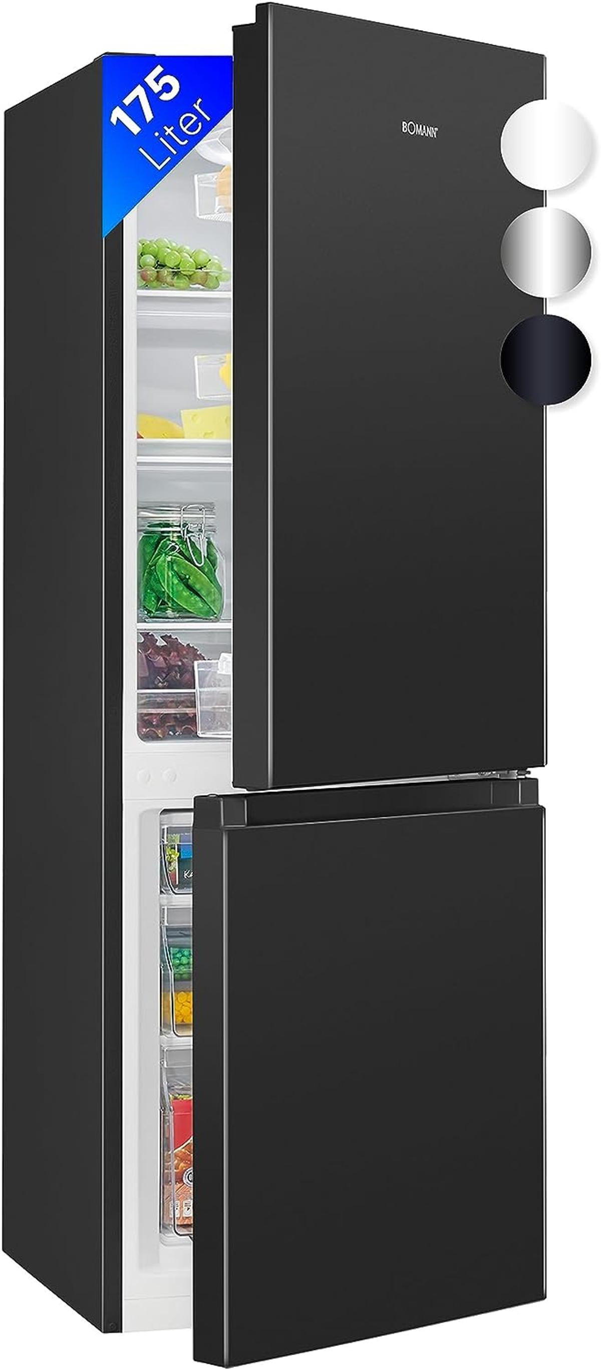 BOMANN fertigt Modelle in verschiedenen Größen an. Bei einer kleineren BOMANN Kühl-Gefrierkombi mit einem Gefrierabteil von bis zu rund 50 Litern Inhalt ist das Eisfach über der Kühleinheit angeordnet. Da sich solche Fächer sehr übersichtlich in Augenhöhe befinden, verzichtet der Hersteller hier auf Schubfächer, die den Zugang in dieser Position erschweren würden. Bei einer BOMANN Kühl-Gefrierkombination mit mehr Gefriervolumen ist das Gefrierteil unterhalb des Kühlschranks angeordnet. Schubladen in verschiedener Größe erleichtern das Verstauen, den Zugriff und die Übersicht. Benötigen Sie mehr als 300 Liter gesamten Nutzinhalt oder rund 90 Liter Raum im Gefrierabteil, stellen ein Side-by-Side-Kühlschrank oder ein French-Door-Modell passende Alternativen dar, die über bis zu doppelt so viel Stauraum verfügen.
