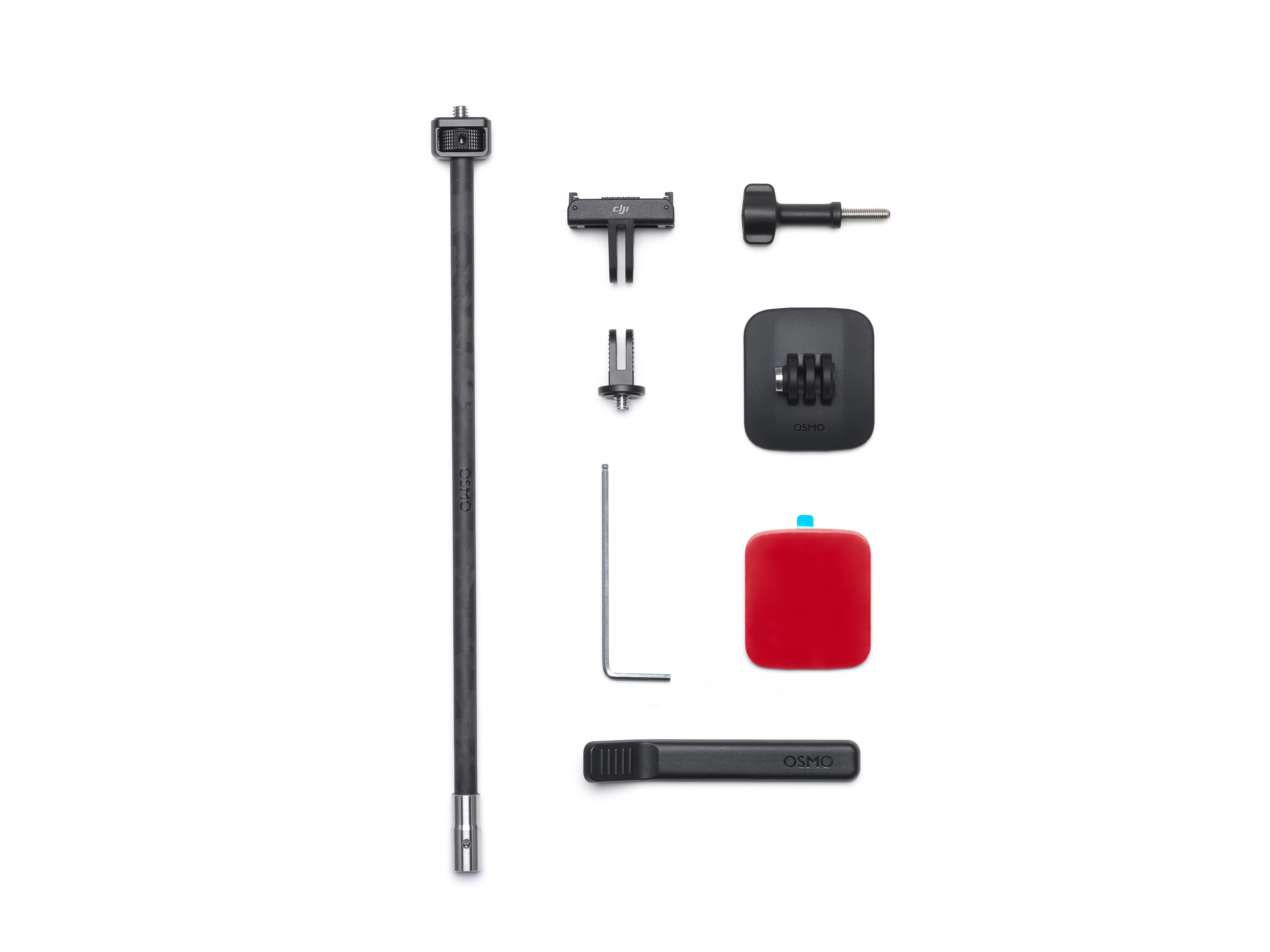 1x Osmo gebogene Klebebasis Max, 1x 28 cm Carbonfaser-Geradstange, 1x 1/4'' Gewinde auf Zwei-Zinken Adapter, 1x Osmo Action Schnellverschluss-Adapterhalterung, 1x Osmo Feststellschraube, 1x Schraubensicherungsschlüssel, 1x Sechskantschlüssel