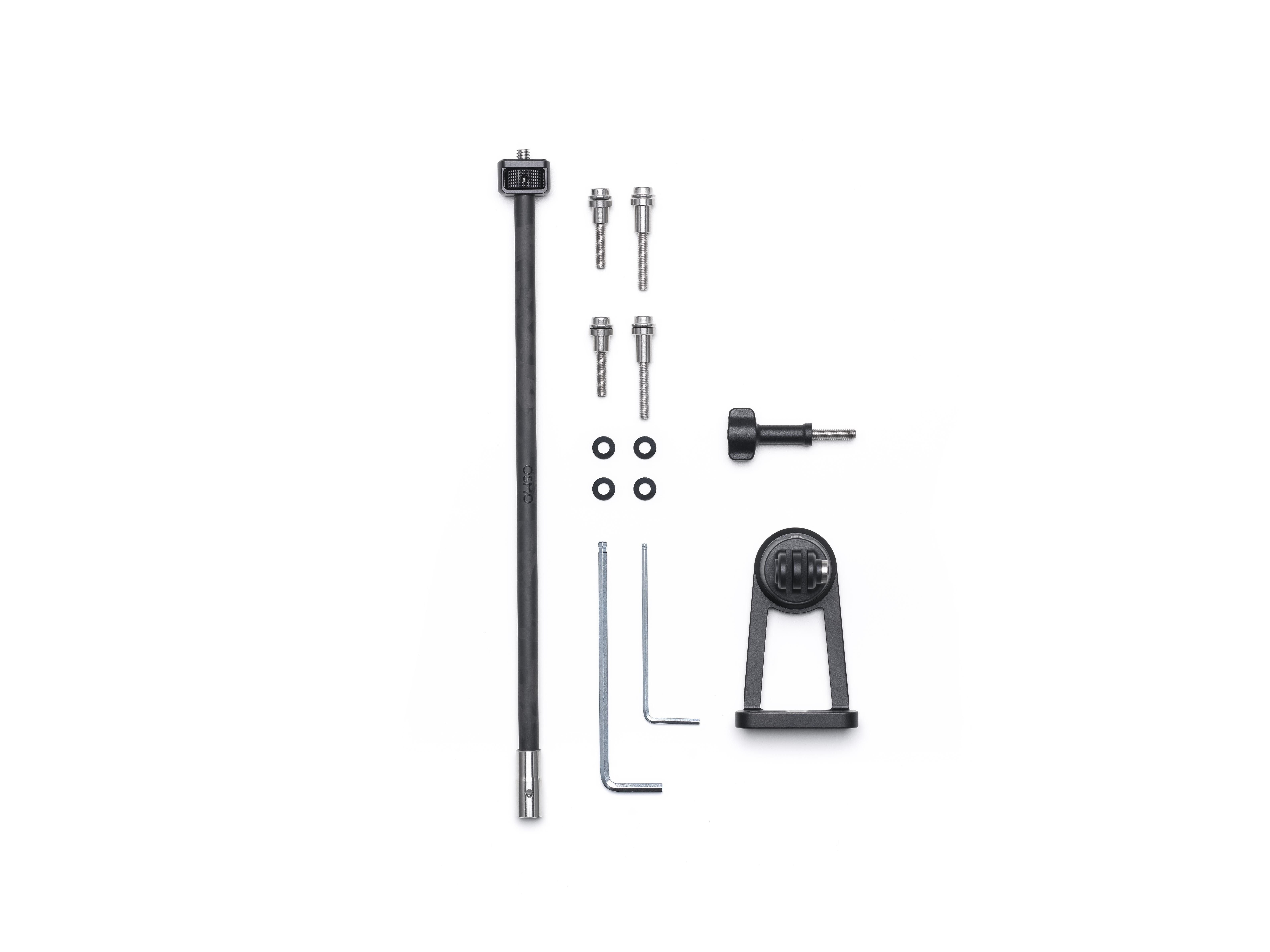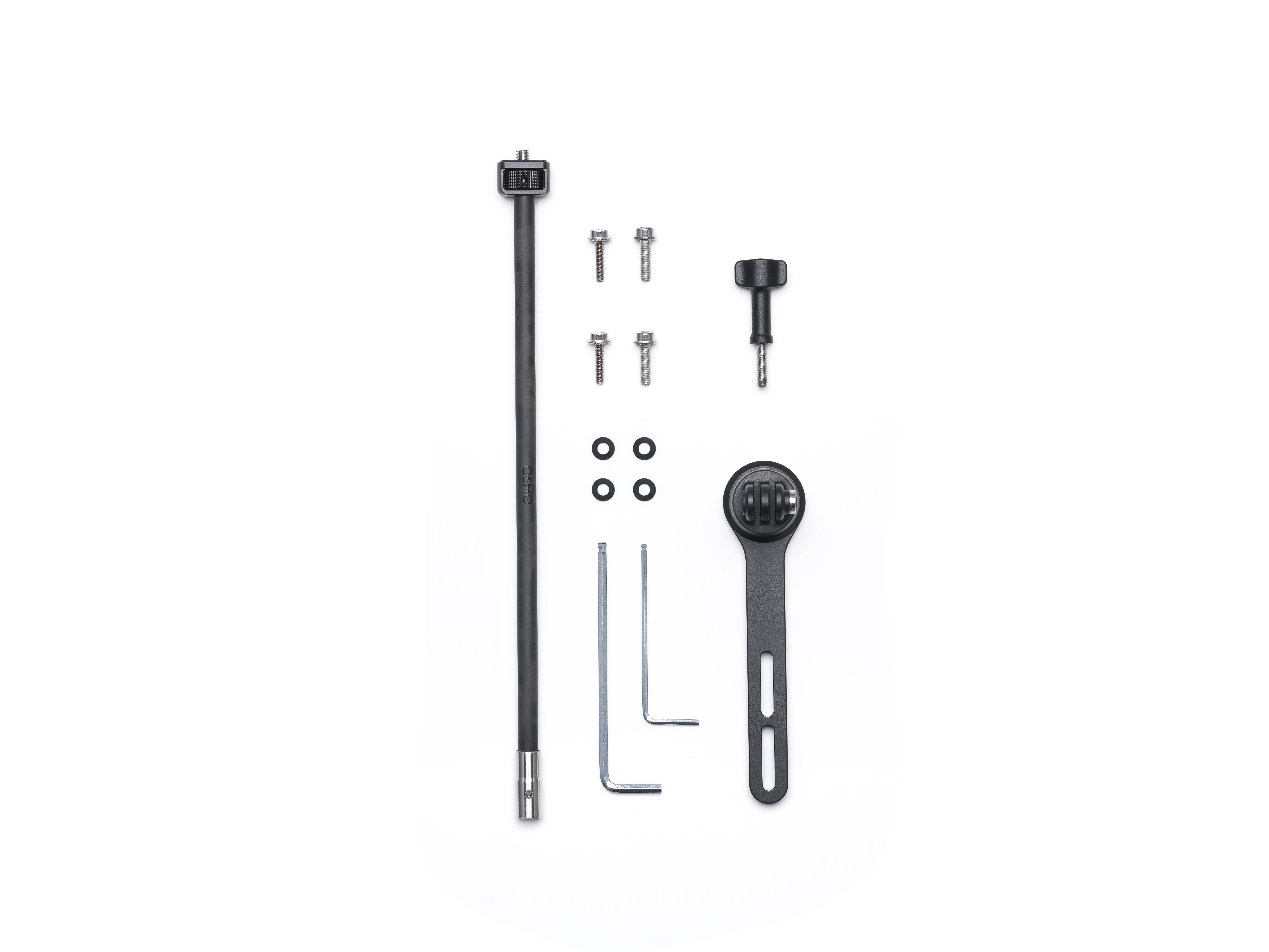 1x Osmo multifunktionale Fahrradhalterung (unabhängige Lenker), 1x 28 cm Carbonfaser-Geradstange, 1x Osmo Feststellschraube, 2x Sechskantschlüssel, 2x M5 Schraube, 2x M4 Schraube, 2x Langer Schraubring, 2x Kurzer Schraubring, 4x Sicherungsunterlegscheibe