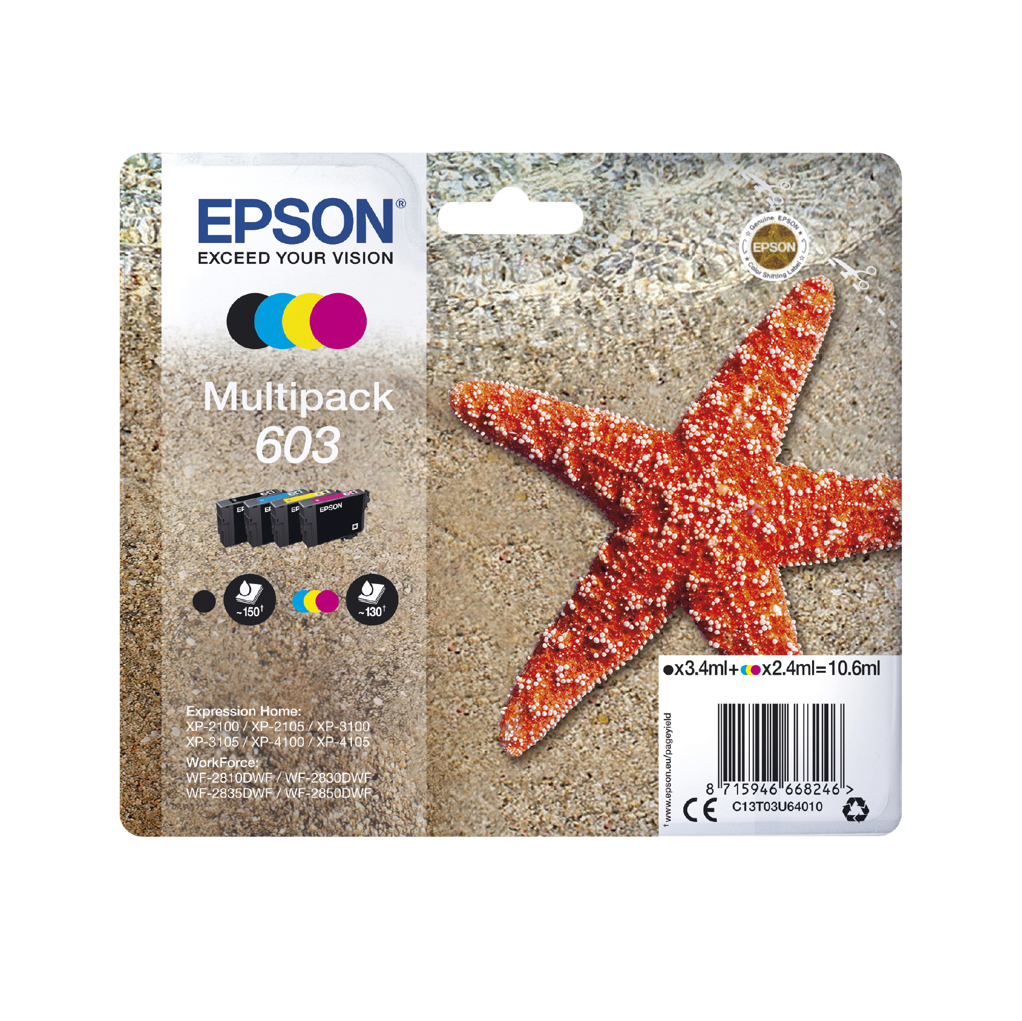 EPSON XP3100 XP4100 Multipack Seestern, 603, 4-farbig, Tintenpatrone Schwarz, Cyan, Gelb, Magenta (C13T03U64010)