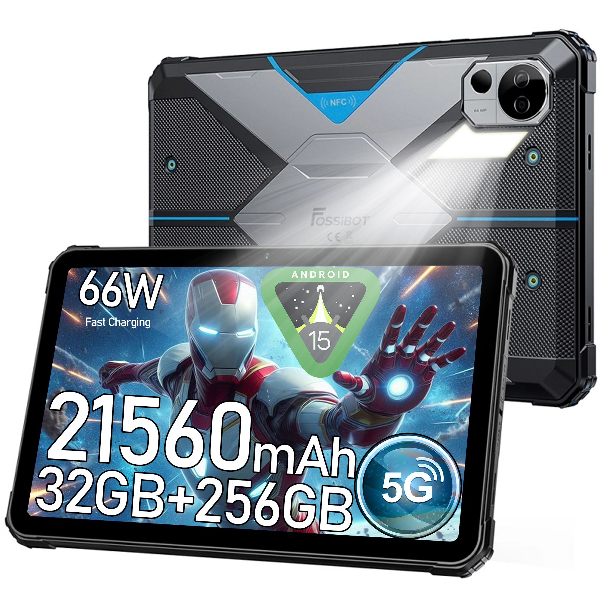 FOSSIBOT DT3 5G 21560mAh 32GB Campinglicht 64MP 2K FHD+, Tablet, 256 GB, 10,4 Zoll, Blau