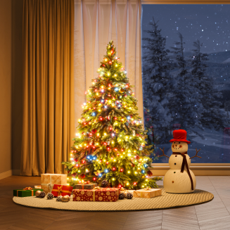 Smartphone mit App-Steuerung vor weihnachtlich dekoriertem Wohnzimmer mit buntem LED-Tannenbaum und Lichterketten.