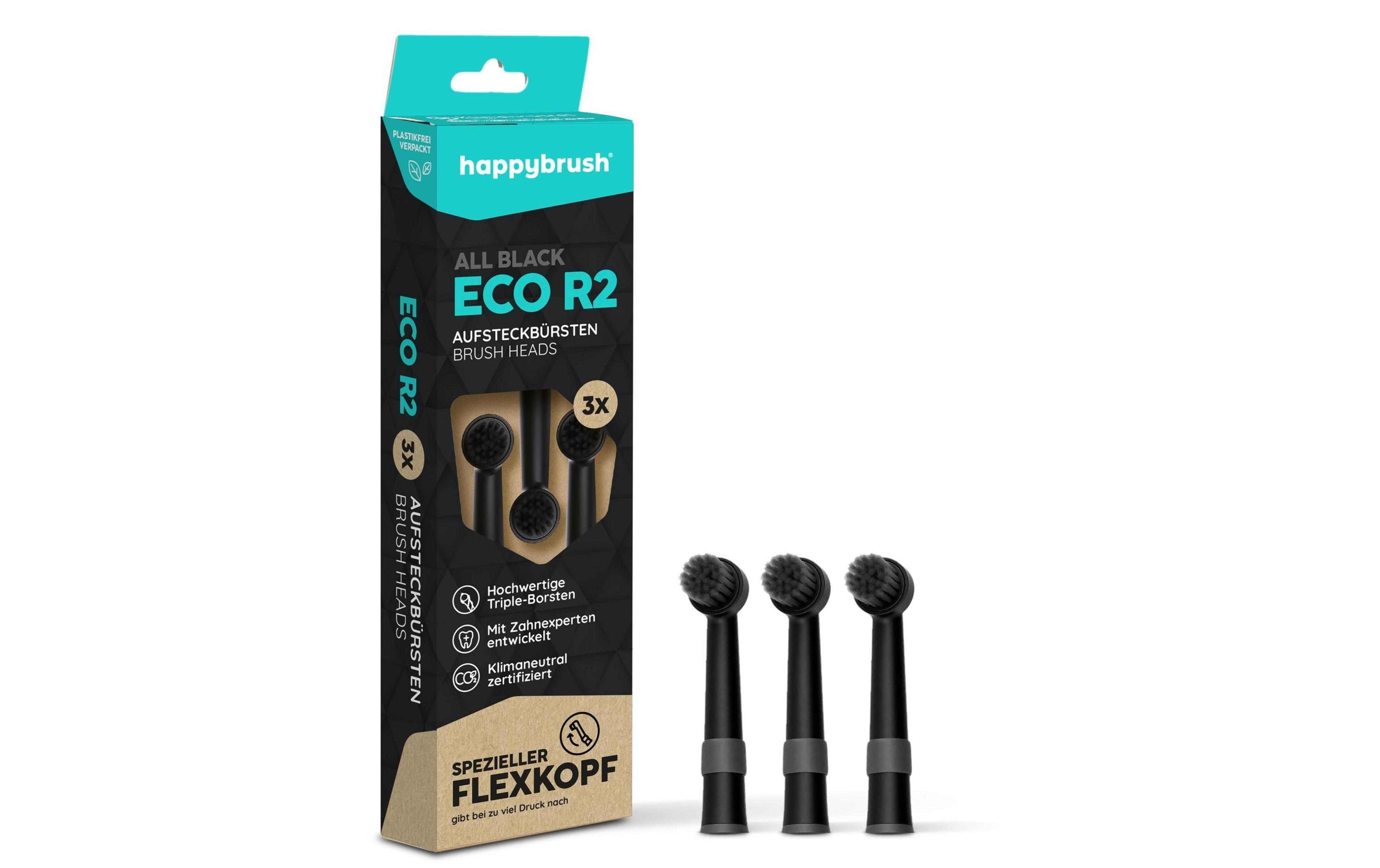 rotierende happybrush Modellen R1, R2 und ECO R2, sowie weitere elektrische Zahnbürsten anderer Hersteller.