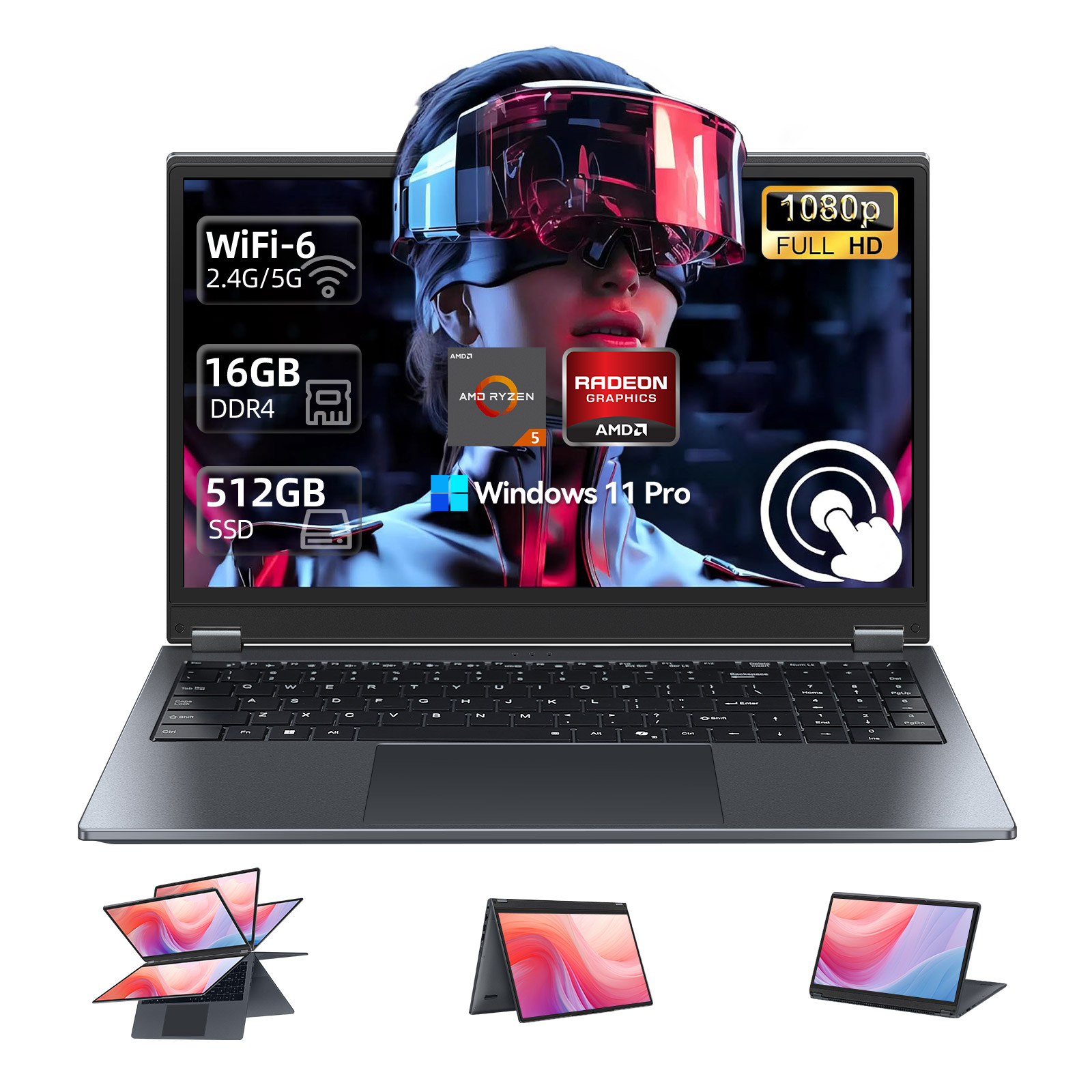 VANWIN Notebook, laptop, mit 15,6 Zoll Display Touchscreen, AMD Ryzen™ 5,Ryzen5 Prozessor, 16 GB RAM, 512 GB SSD, AMD Radeon™ Onboard Graphics, Grey, Windows