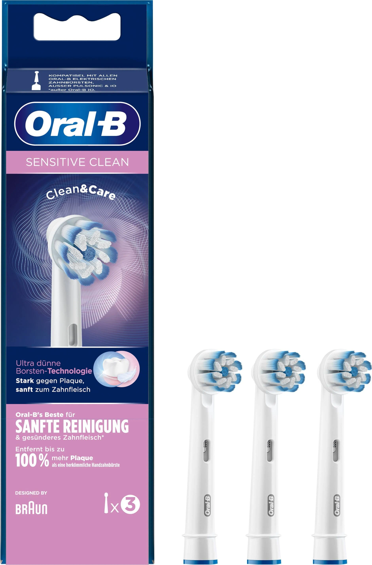 3 Oral-B Sensitive Clean Aufsteckbürsten (aus hygienischen Gründen einzeln verpackt).