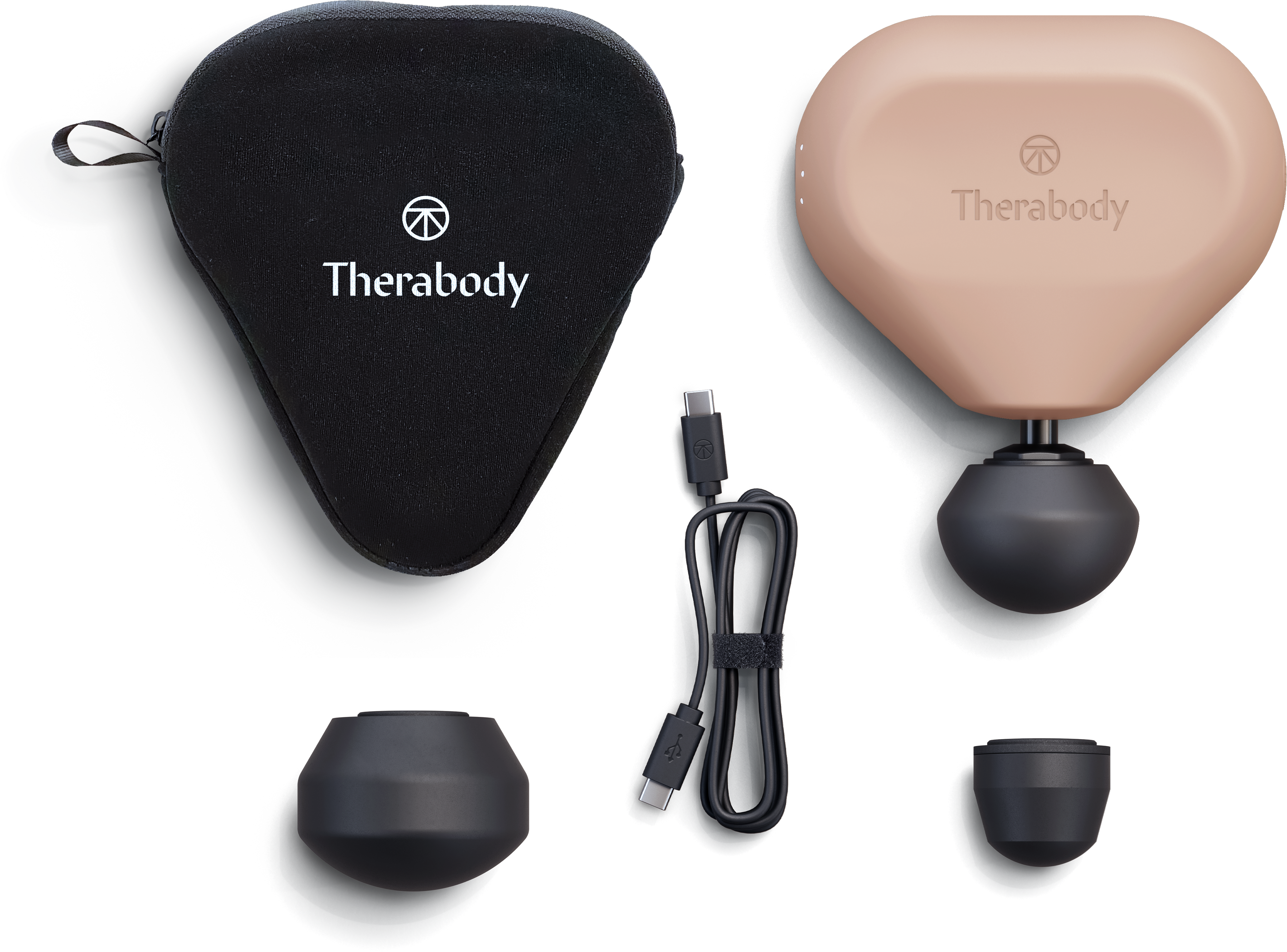 Theragun Relief-Gerät, 3 Massageaufsätze - Standard-Ball-Aufsatz + Dampener-Aufsatz + Thumb-Aufsatz, USB-C-Ladekabel, Bedienungsanleitung.