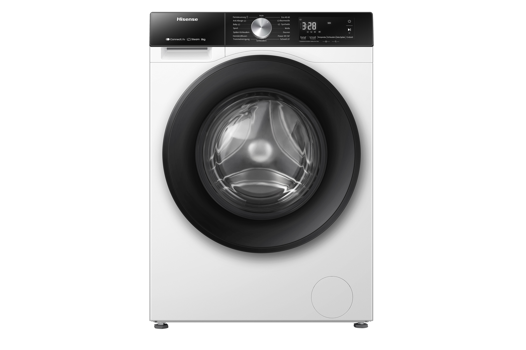 Halbseitliche Aufnahme der weißen Waschmaschine Hisense WF3S8043BW3 mit schwarzem Bedienpanel.