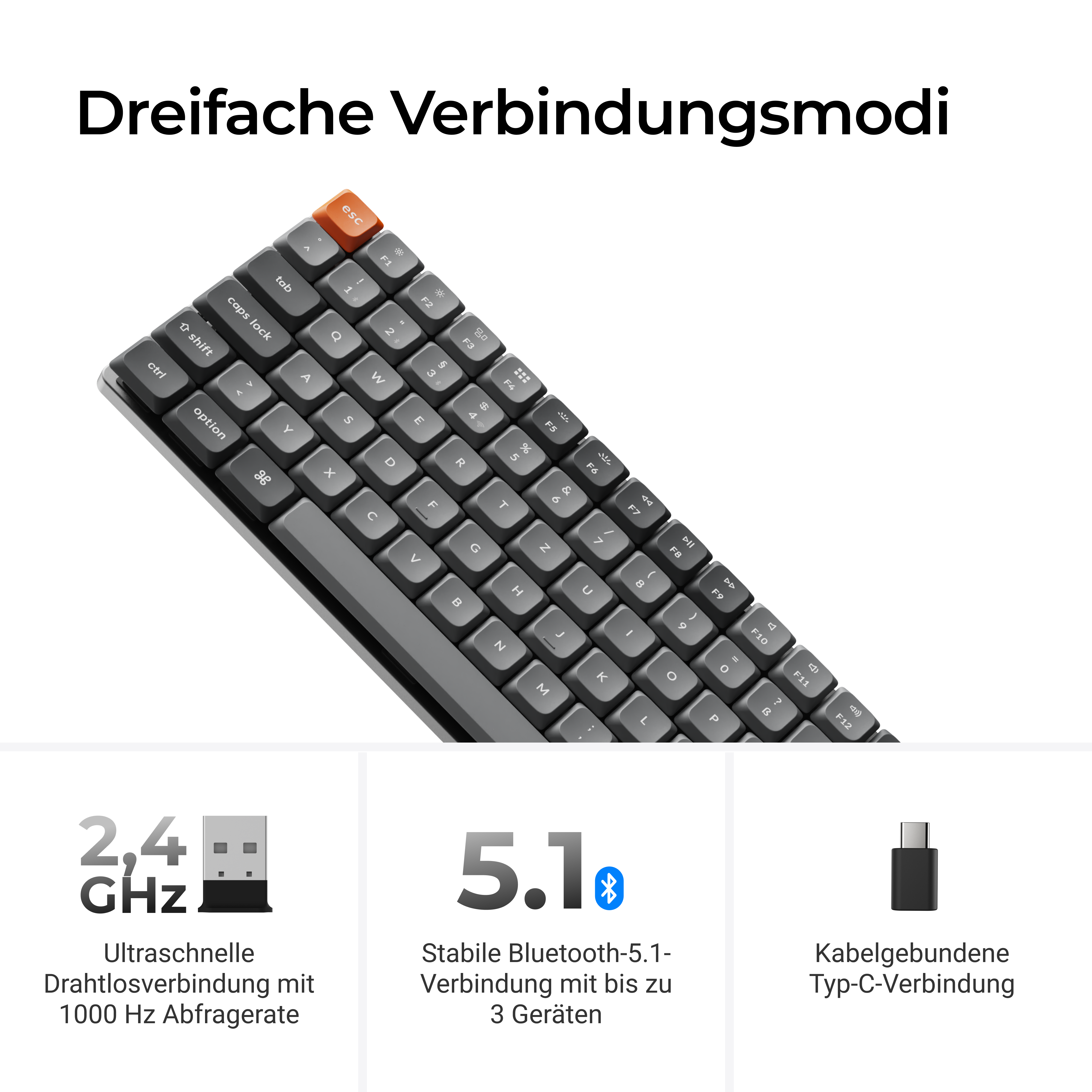 Du suchst eine kompakte mechanische Tastatur zum komfortablen Schreiben und Mitnehmen? Dann ist die Keychron K3 Max eine gute Wahl. Mit ihrem 75-Prozent-Layout ohne Ziffernblock ist die Keychron K3 Max noch kompakter als TKL-Tastaturen (80 Prozent). Möglich wird das durch enger beieinanderliegende Tasten – ohne Freiräume dazwischen.