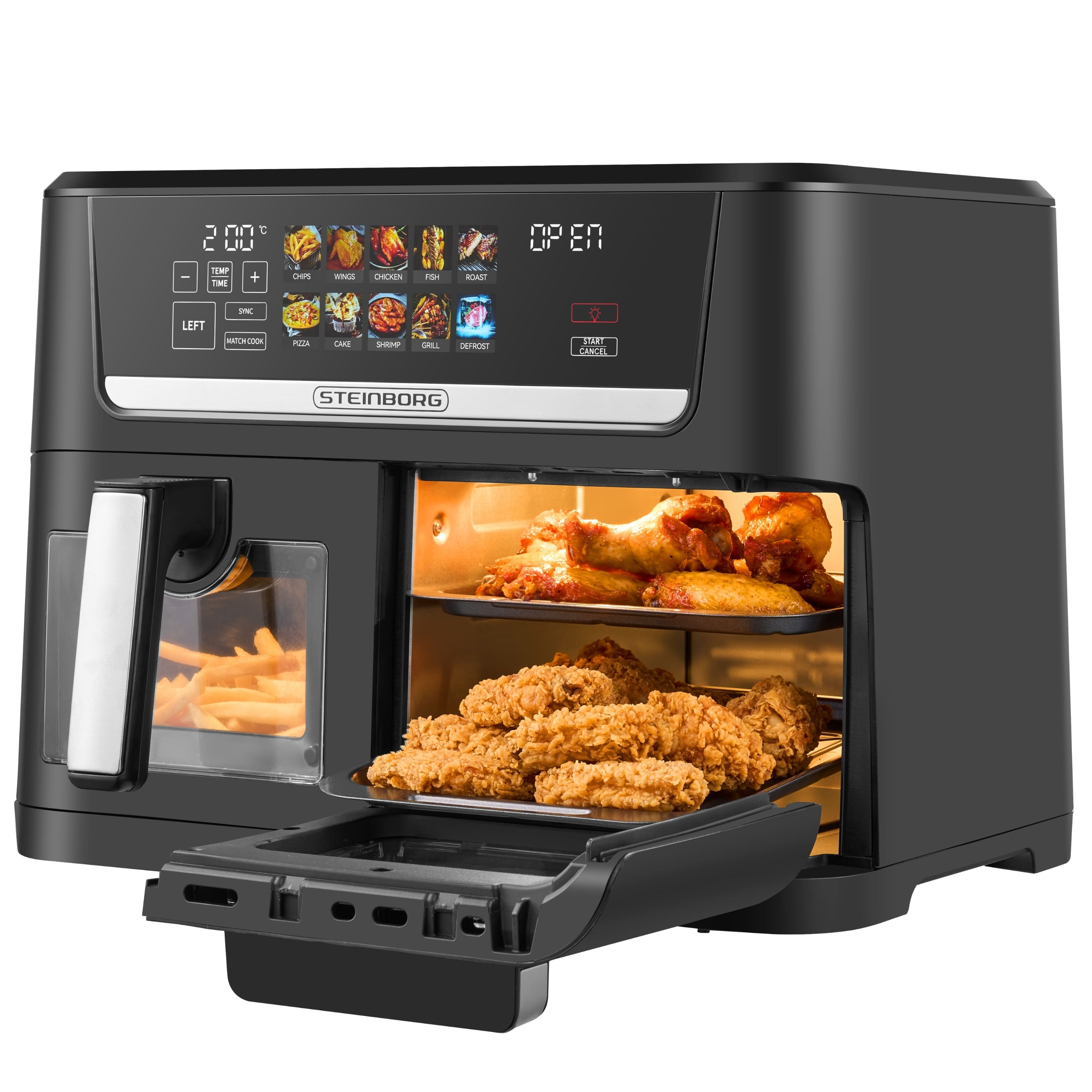 1 Heissluftfritteuse, 2x 4.75 L Heißluft-Frittierfächer mit Antihaftbeschichtung, 2x Crisper Gittereinsatz mit Antihaftbeschichtung, 2x Multi-Layer Rost, Rezeptheft, Kurzanleitung, Bedienungsanleitung