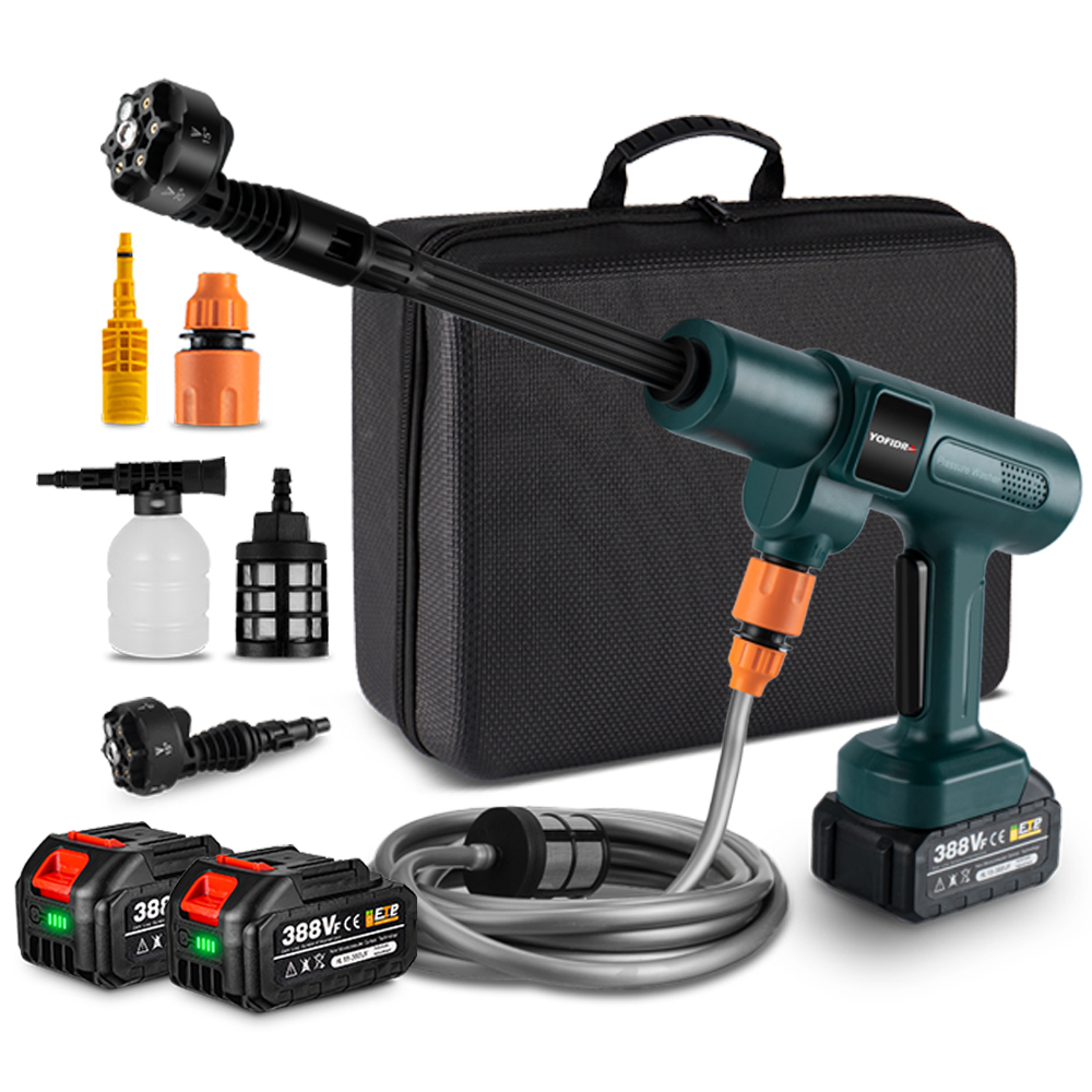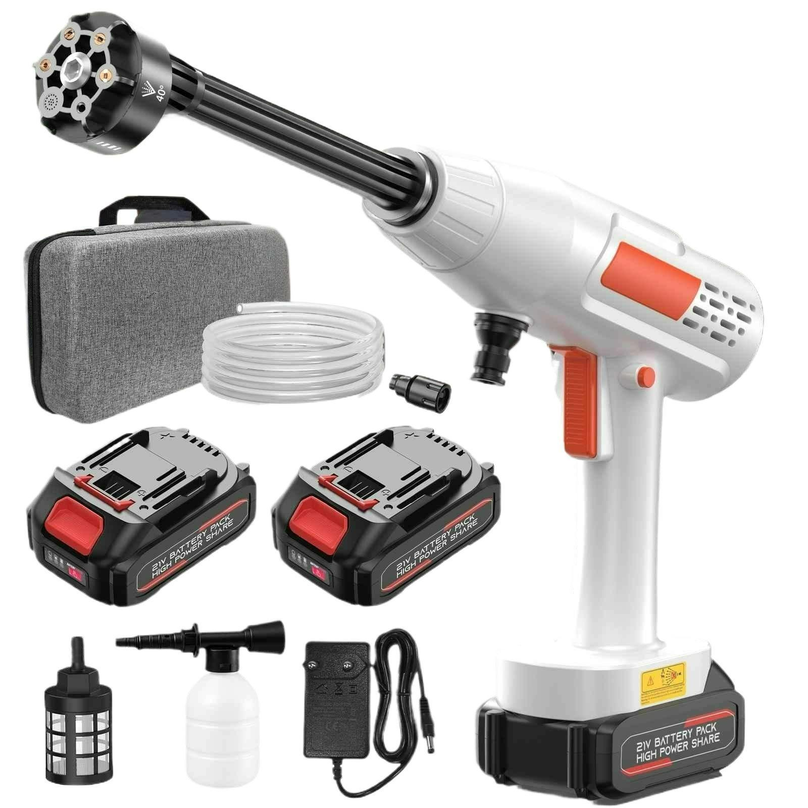 1 x Wasserpistole 1 x 6-in-1-Düse 1 x Boost-Düse 1 x Verstellbare Winkeldüse 1 x Schaumstofftopf 1 x Wasserfilter 1 x 5 m Schlauch 1 x Schnellverschluss-Schnittstelle 1 x Handtasche 2 x Batterie 1 x EU-Ladegerät