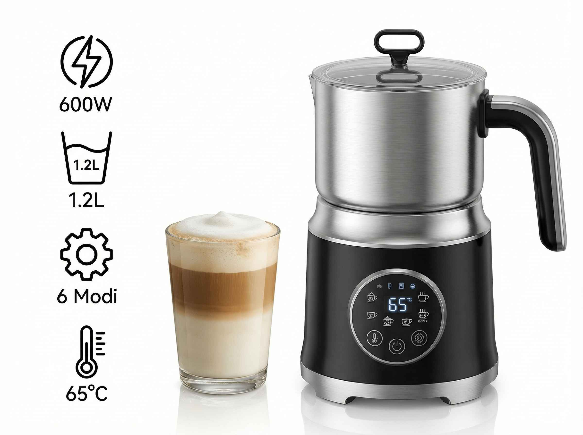 1x Milchaufschäumer-Basis, 1x Edelstahl-Kanne (1,2L), 1x Deckel, 1x Rühreinsatz, 1x Bedienungsanleitung