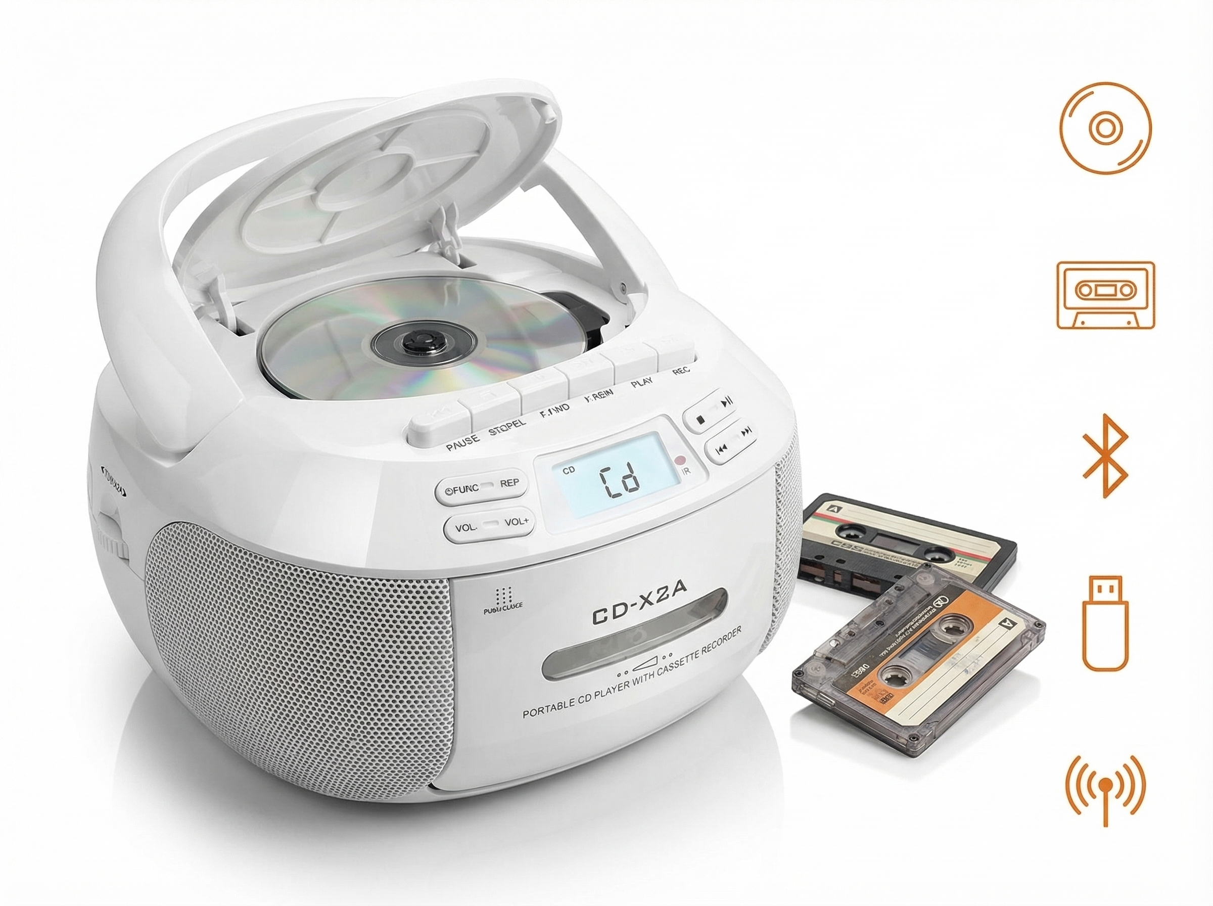 Autostop-Kassettendeck, Dynamic Bass Boost, CD Shuffle/Repeat, AUDIO-IN (3,5 mm), CD, CD-R, CD-RW